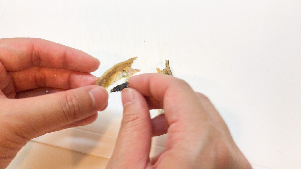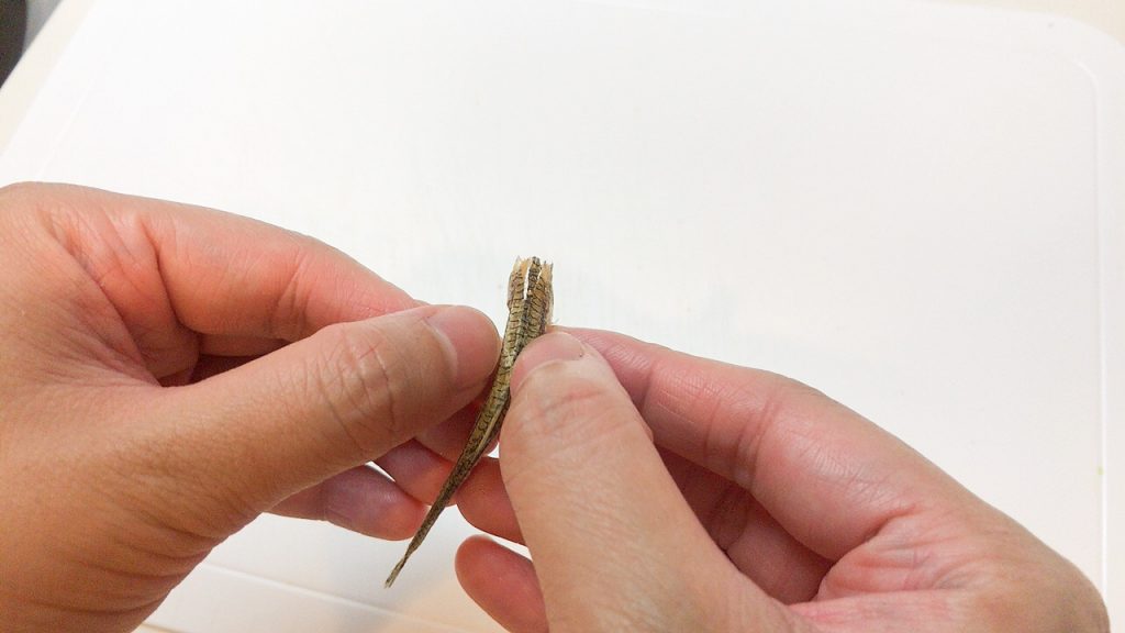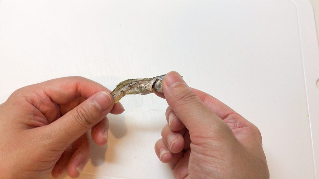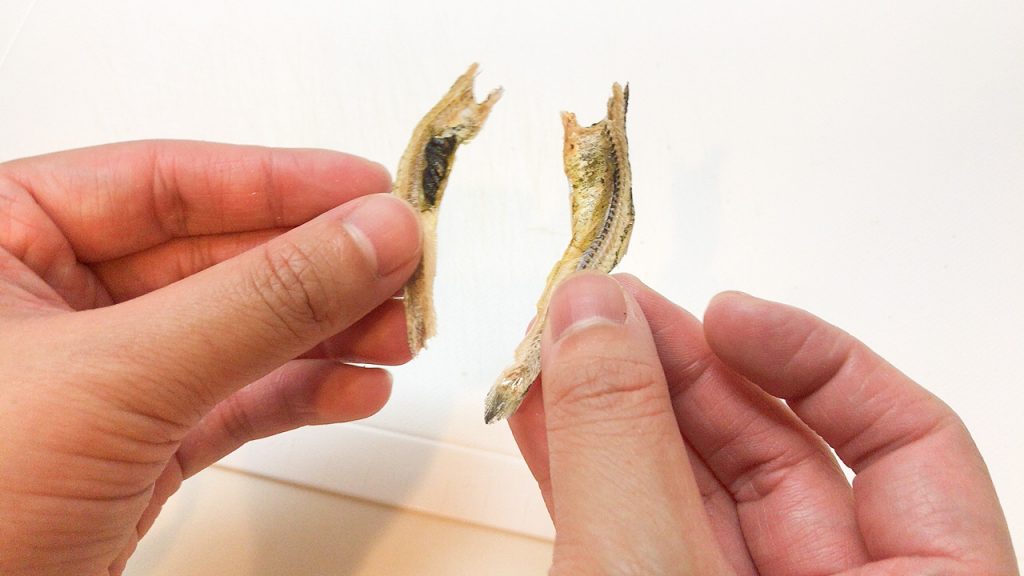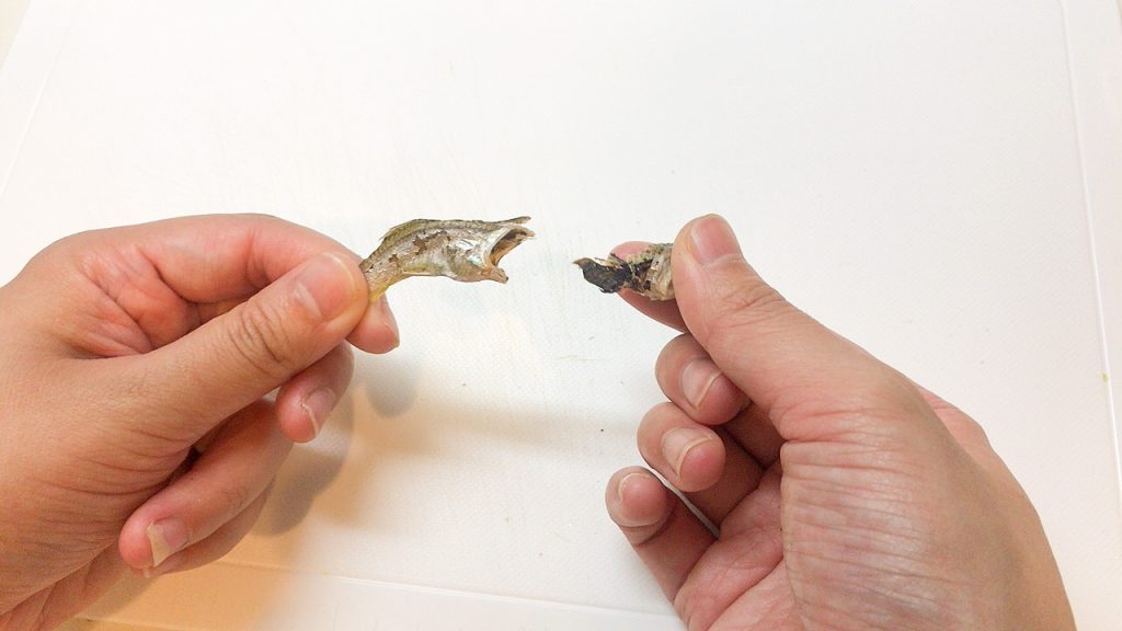 煮干しの頭の部分を持ち、頭の部分を取ります。