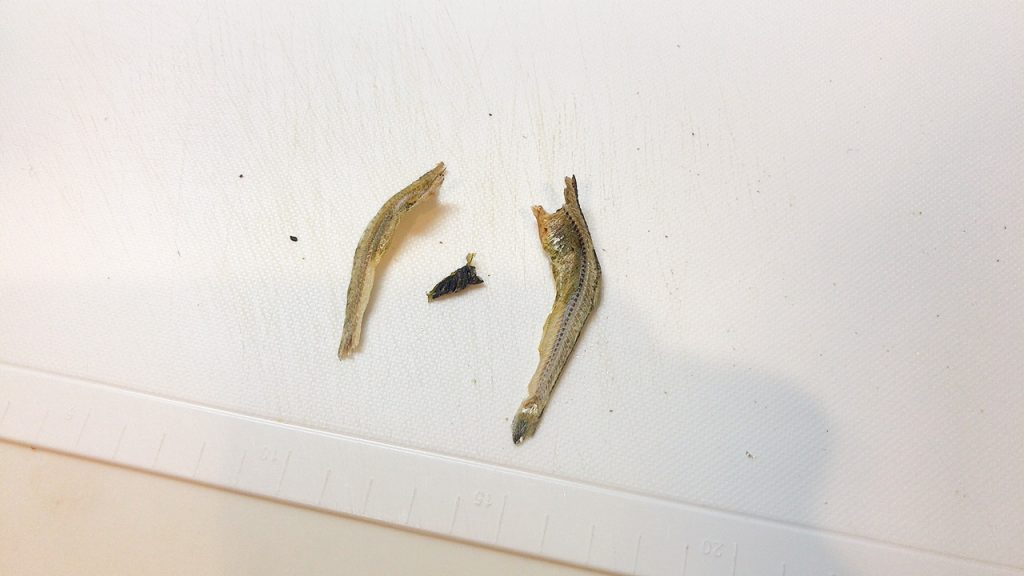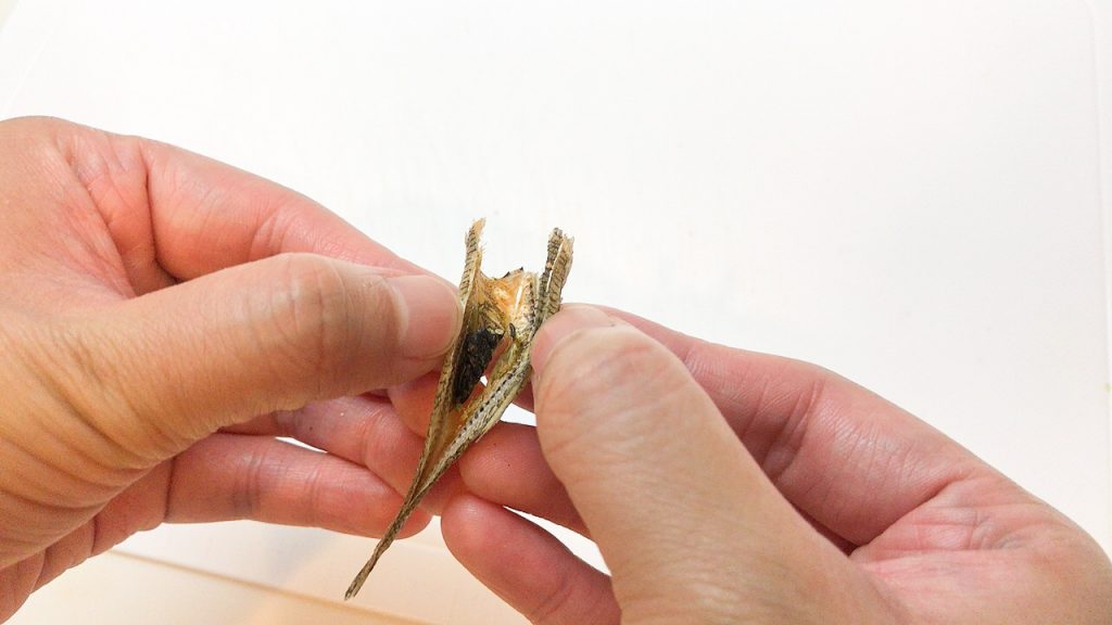 煮干しを裂くと、腹ワタ(黒い固まり)があるのでこれを取り除きます。