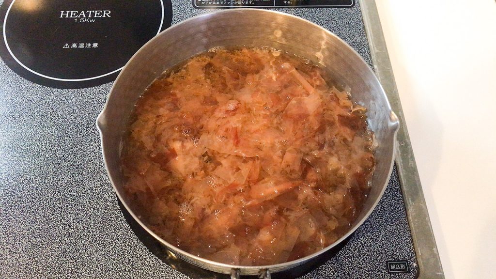 沸騰したら火を止めてかつお節を鍋に加えて、かつお節が底に沈むまで3分ほど置いておきます。