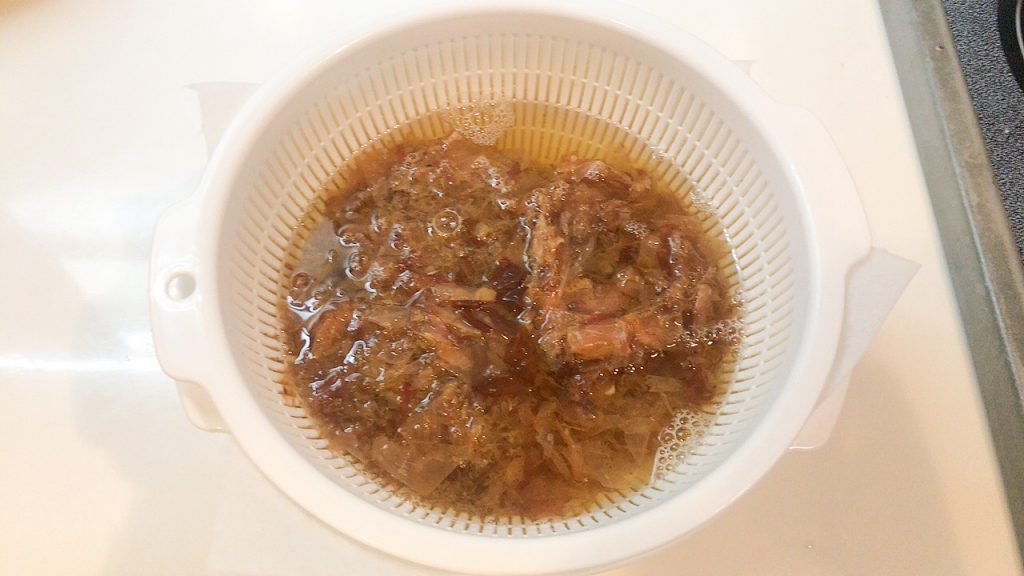 ざるが2つあれば間にキッチンペーパーを挟むと、ペーパーが縮まないので濾しやすいですよ。