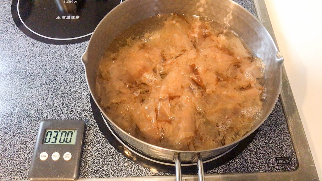 かつお節が底に沈むまで3〜5分ほど置いておきます。
