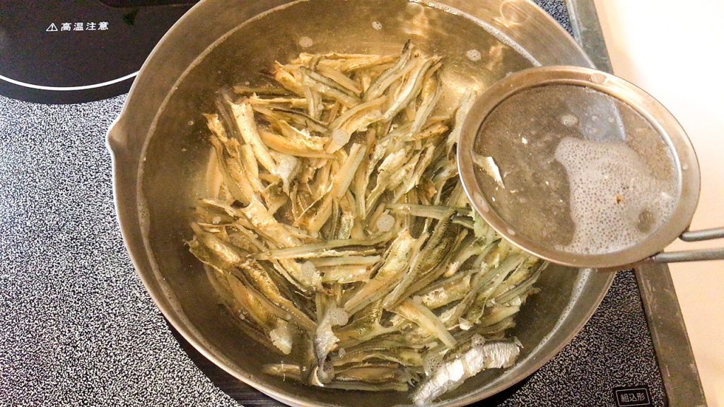 アクを取った煮干し出汁は長い時間置いてしまうと生臭さやえぐみが出てしまいます。煮出したらすぐに濾しましょう。