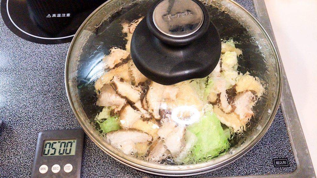 鍋にフタをして中火にかけて、沸いたら火を少し弱めて5分ほど煮ます。