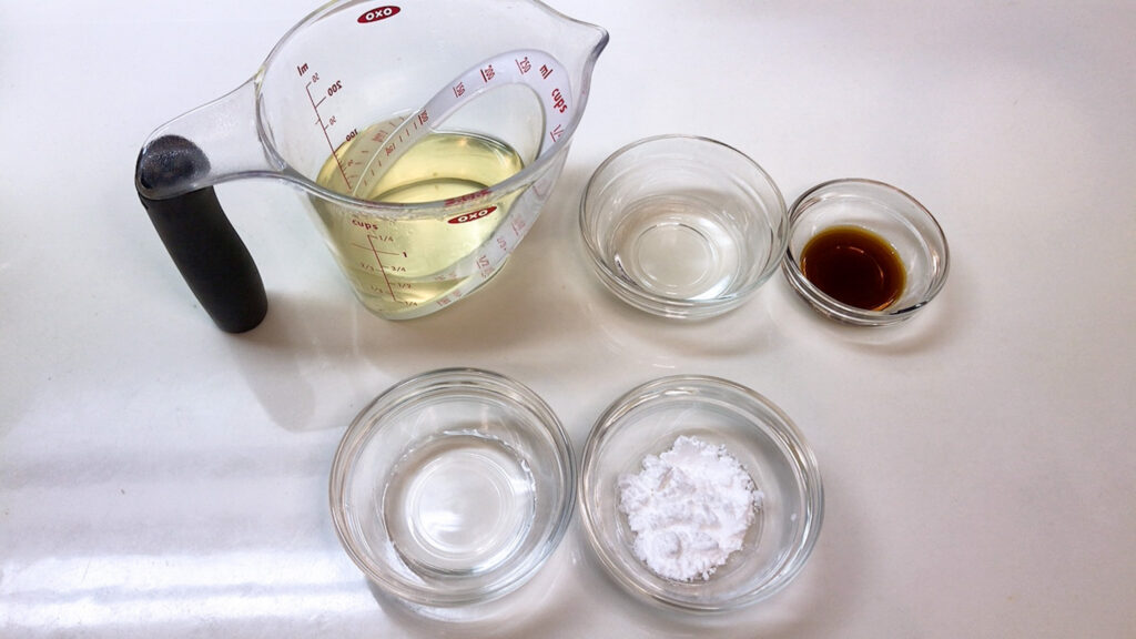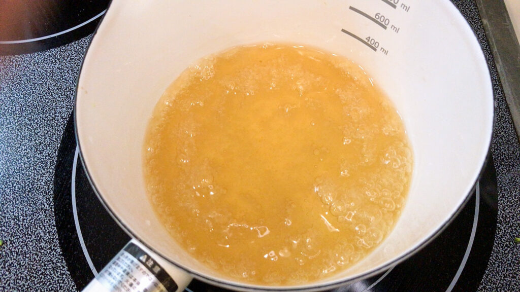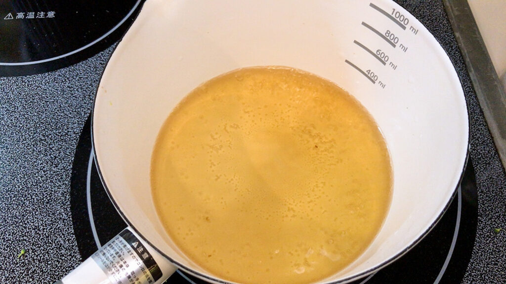 出汁を1カップ(200ml)用意します。今回はかつお出汁を使いました。
