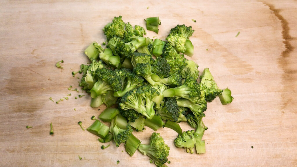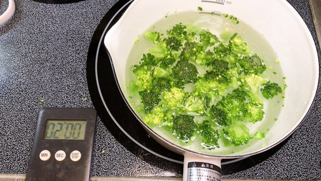 熱湯に塩少々を入れ、ブロッコリーを2分ほど茹でます。
