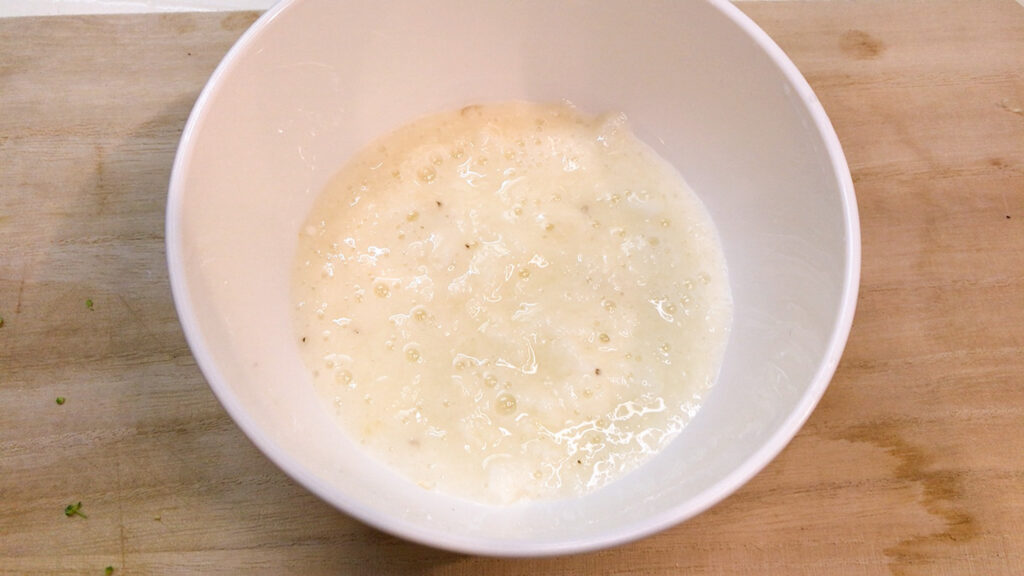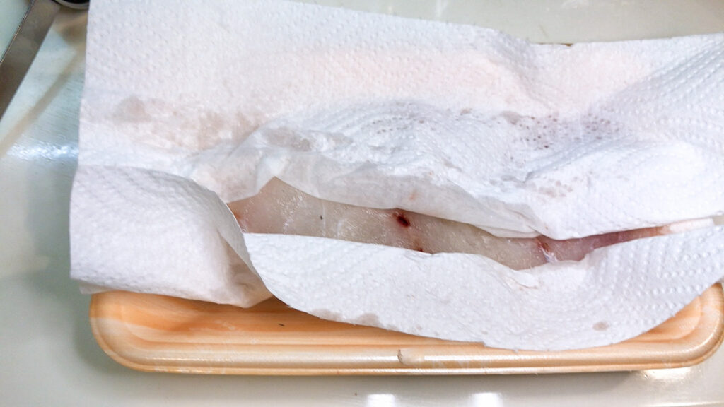 たらは塩(小さじ1/3)をふって10分ほどおいたら水気をふきます。臭み抜きと下味を兼ねています。