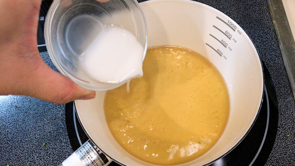 水溶き片栗粉(大さじ1と水大さじ1)でとろみをつけてくずあんの出来上がりです。