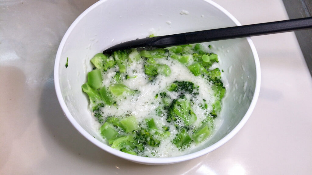 すりおろした長芋と茹でたブロッコリーと塩(少々)を加えて混ぜます。