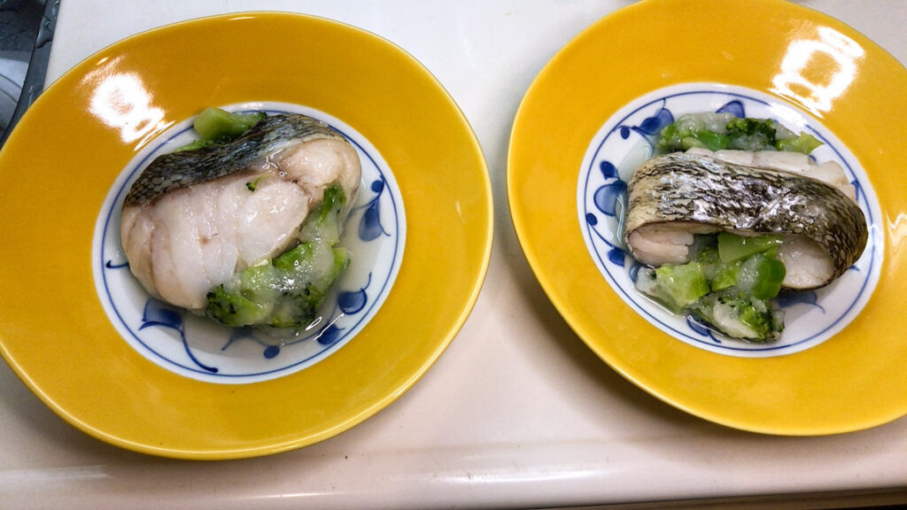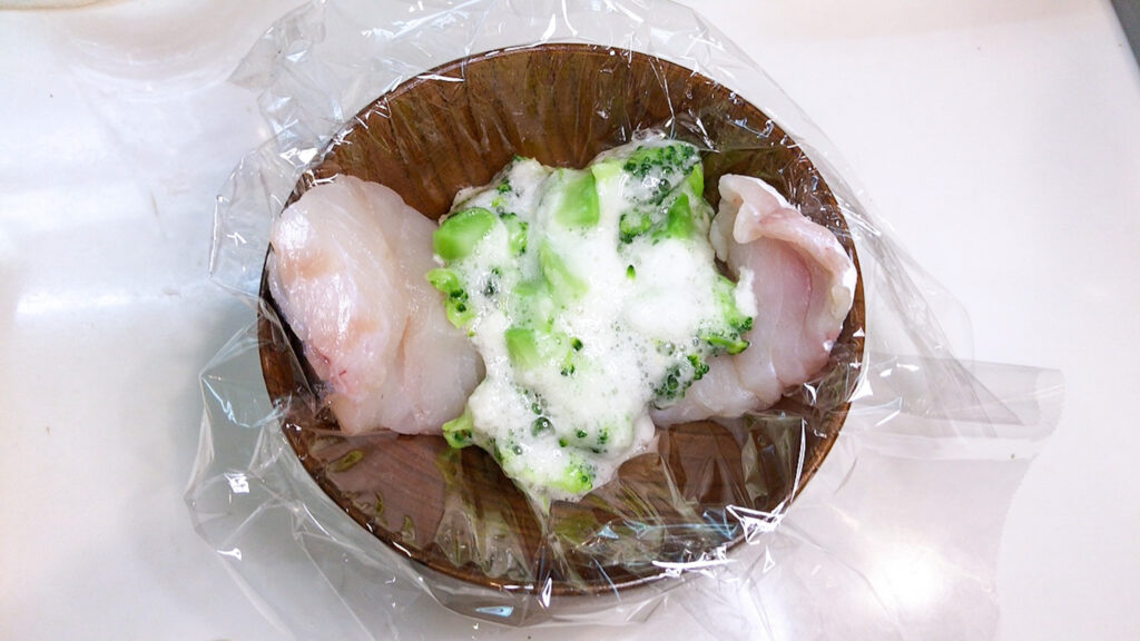 たら1切れを皮目を下にして入れ、長芋とブロッコリーをあえたものを1/4量をのせます。