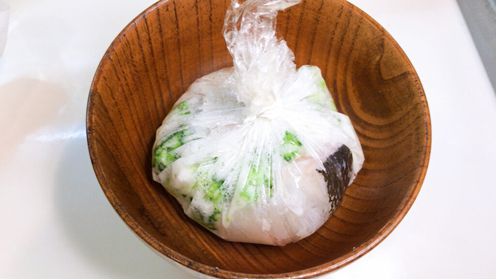 ラップで茶巾に包み、上部をシリコン製輪ゴムやタコ糸でとめます。