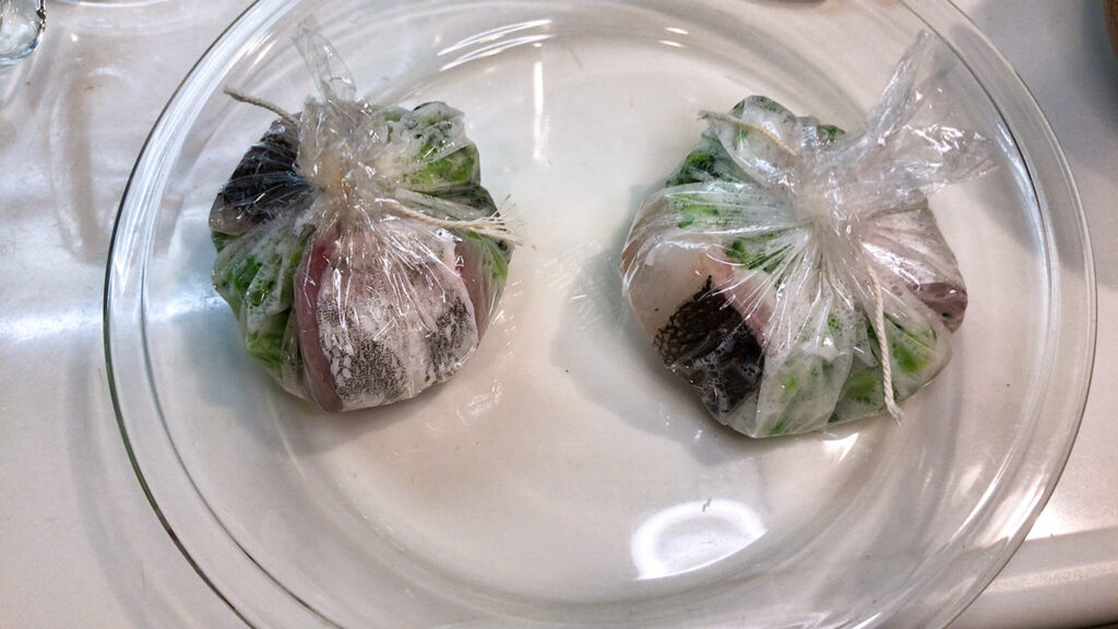 茶巾のラップをはずし、たらを上にして器に盛ります。