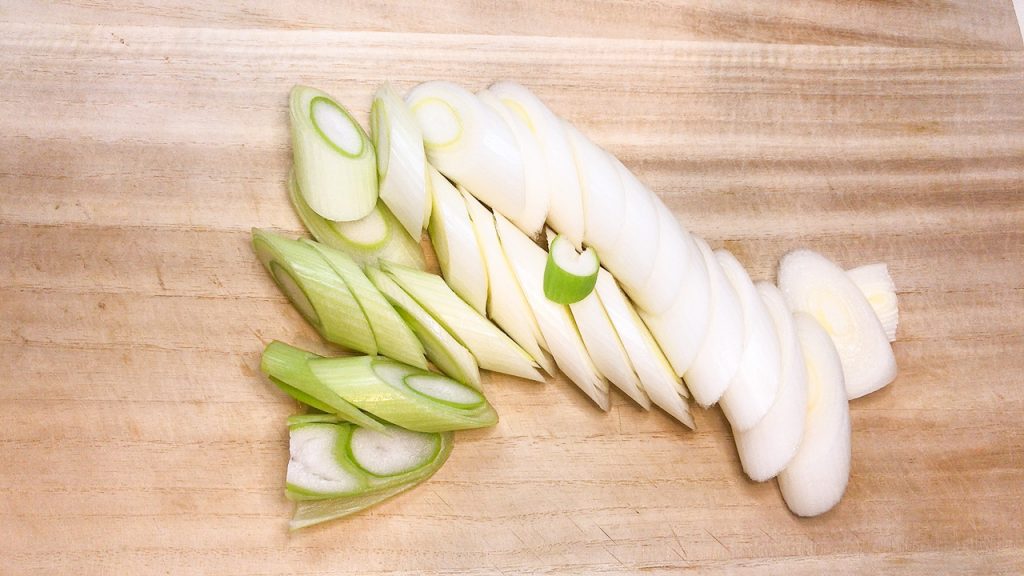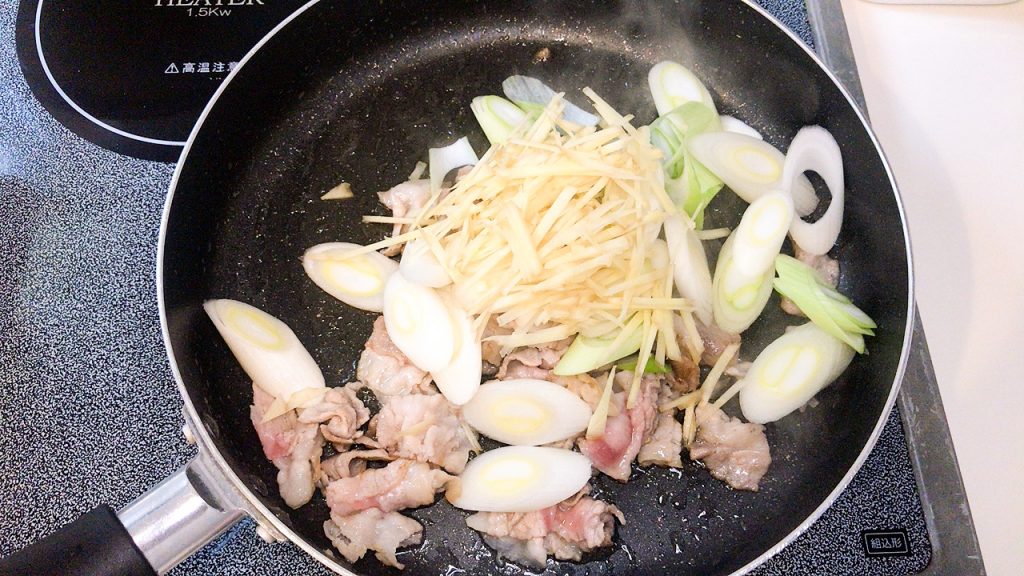 豚肉の色が変わったら、ねぎ、しょうがを加えて炒めます。