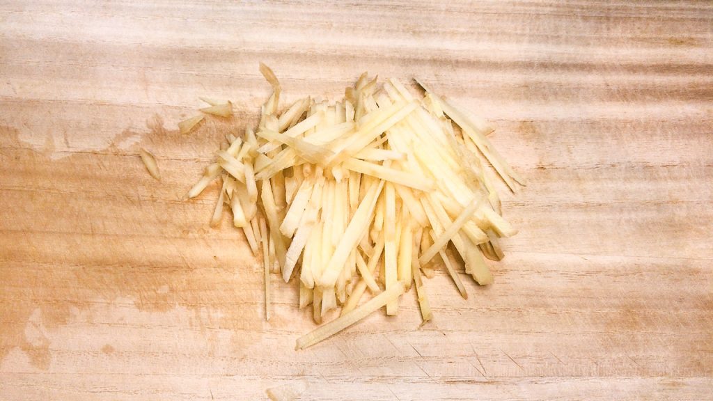 しょうがは皮付きのまま使うので、しっかりと洗って汚れを落としてから千切りにします。