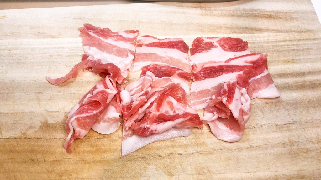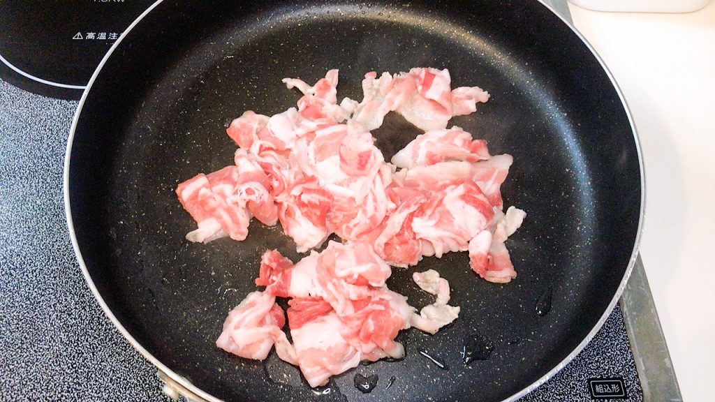フライパンにサラダ油を入れ中火で熱して豚肉を炒めます。