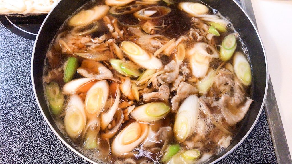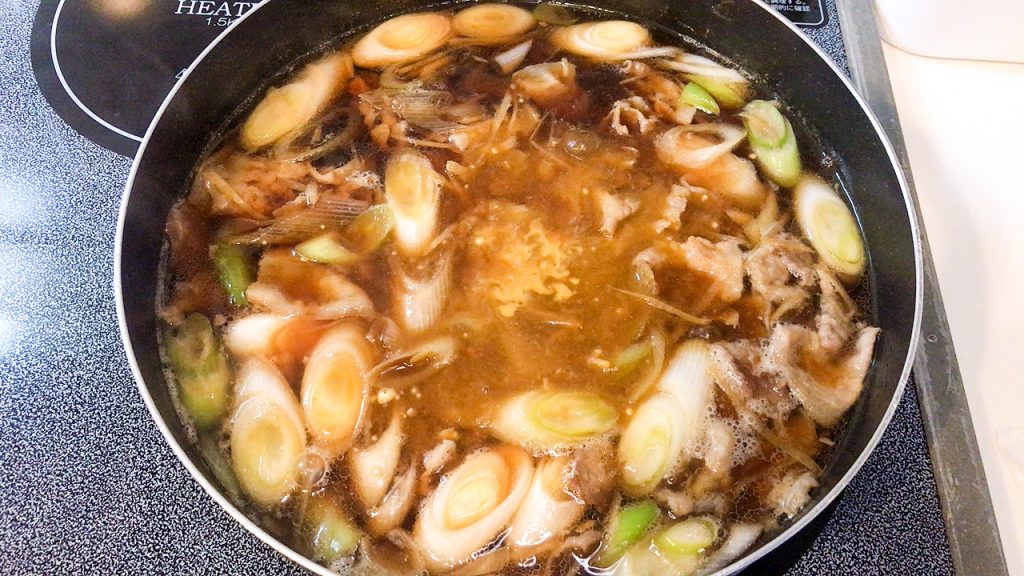 長ねぎがしんなりとしてきたら出汁、醤油、みりんを加えて煮立たせます。
