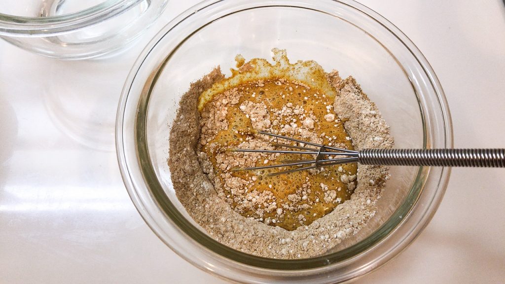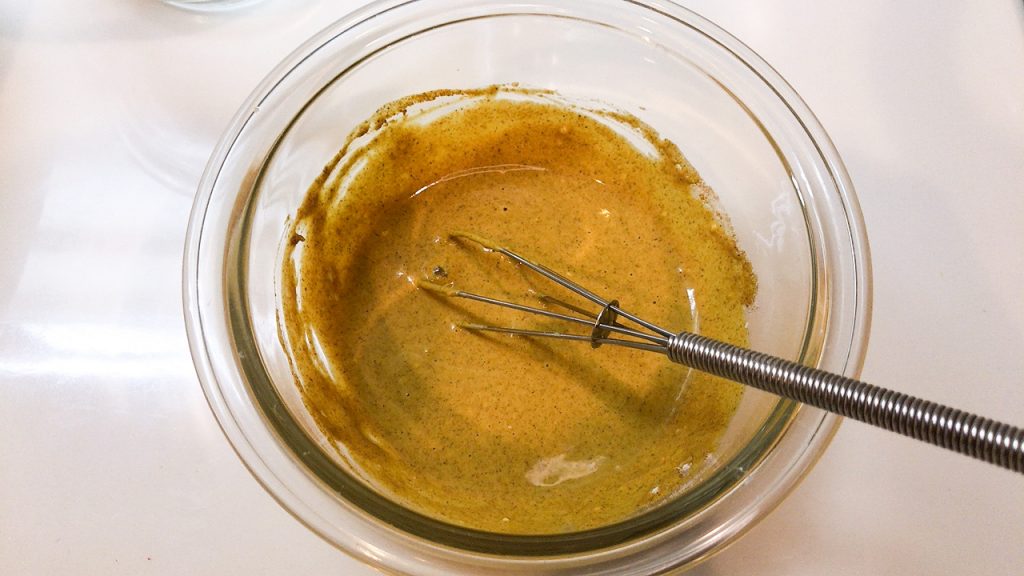 ボウルに小麦粉、カレー粉、ガラムマサラを入れて一度混ぜ、出汁を加えてさらに混ぜます。
