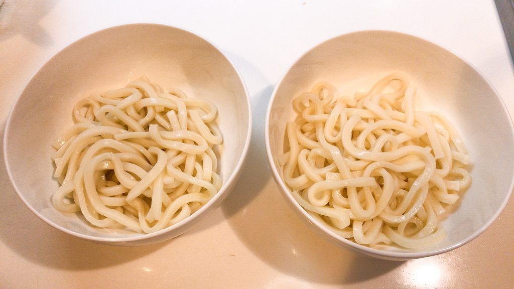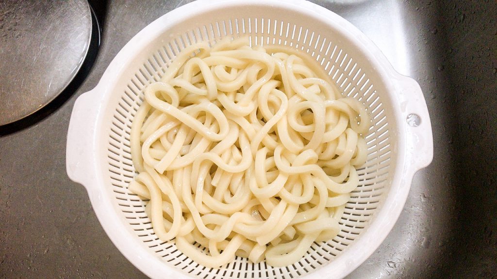 ゆでうどんは熱湯で時間通りに温め、ザルに上げて湯をしっかりと切り、器に盛っておきます。
