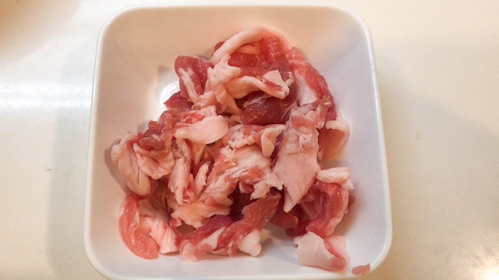 こま切れがなかったので、バラ肉を食べやすい大きさにカットしました。こま切れであれば切らなくて大丈夫です。