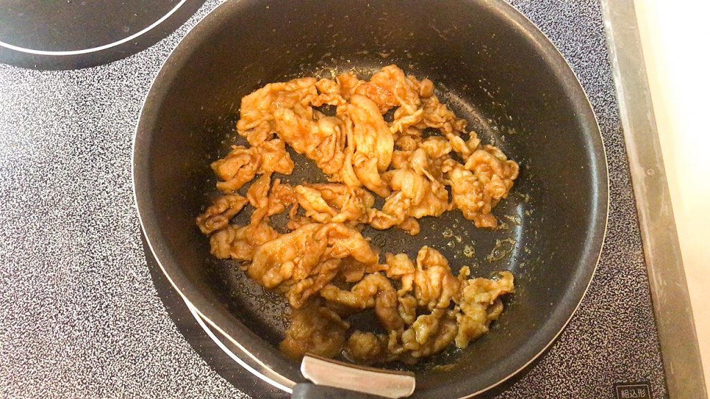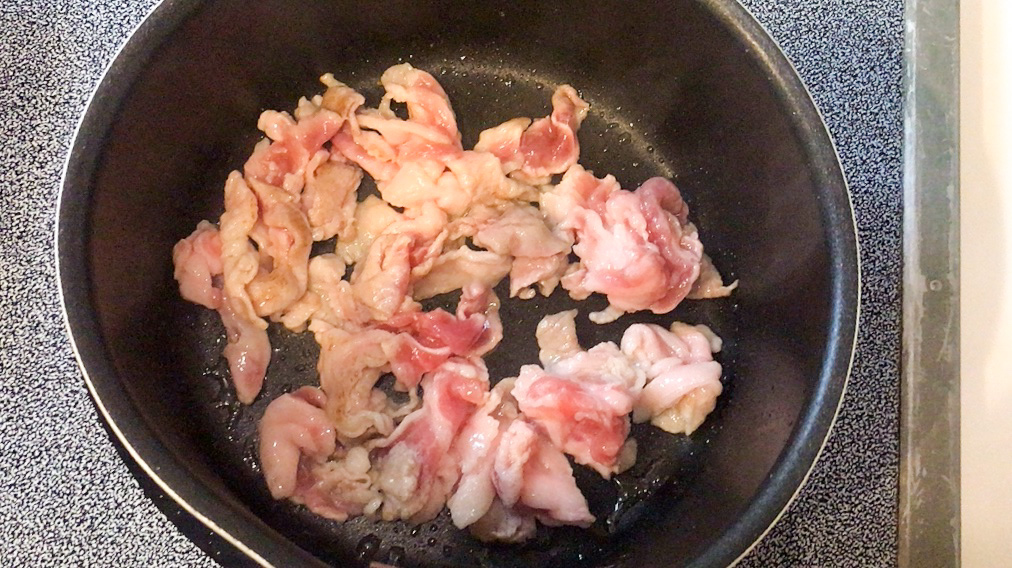 鍋に油を入れて色が変わるまで豚肉を炒めます。