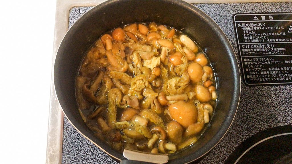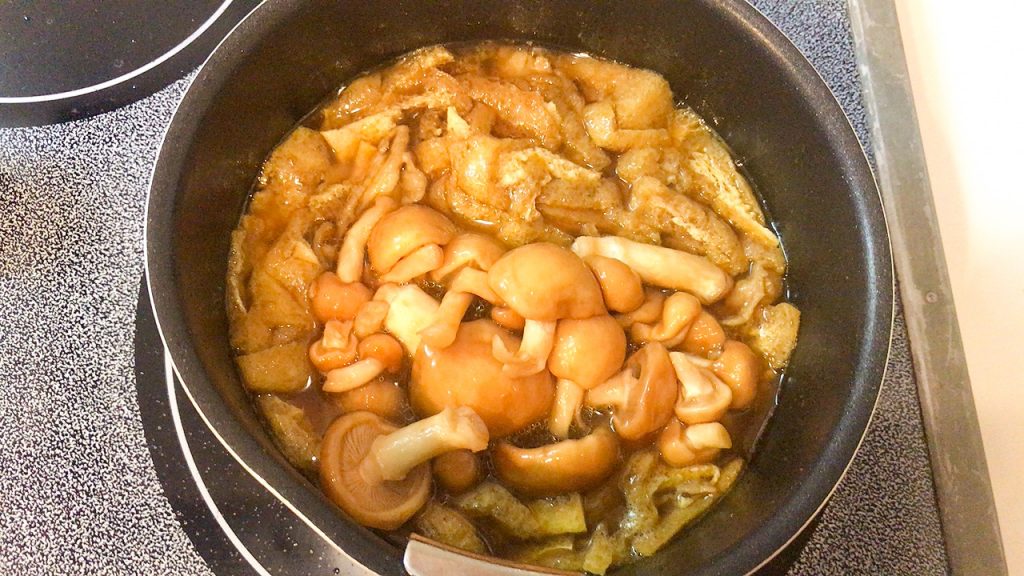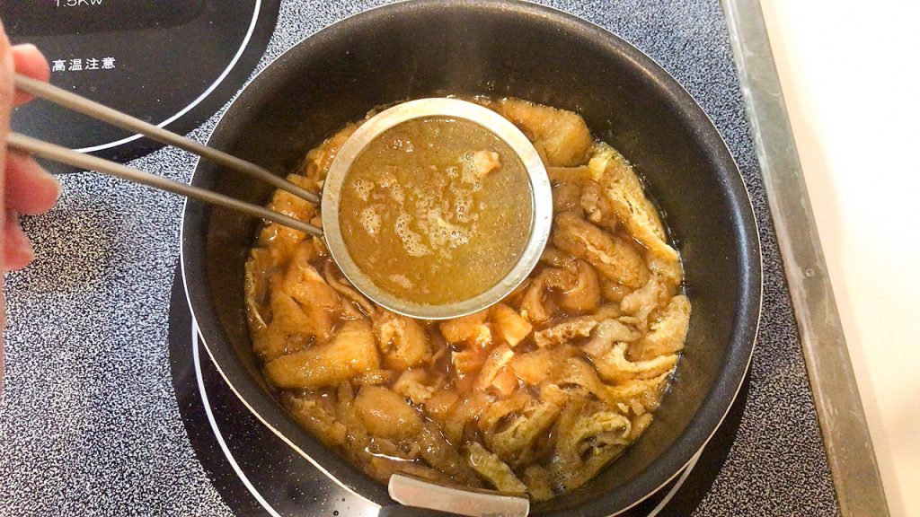 出汁、醤油・酒・砂糖、油揚げを加えて煮立たせます。