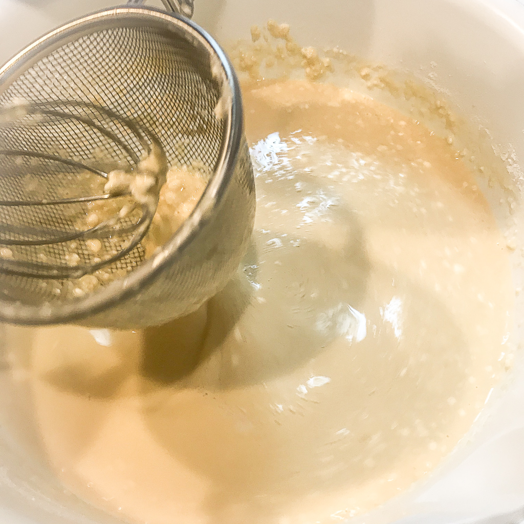 粉に対して出汁が多いため、少しずつ出汁を加えてダマにならないよう混ぜましょう。写真のようにこし器を使うとダマをすくえます。