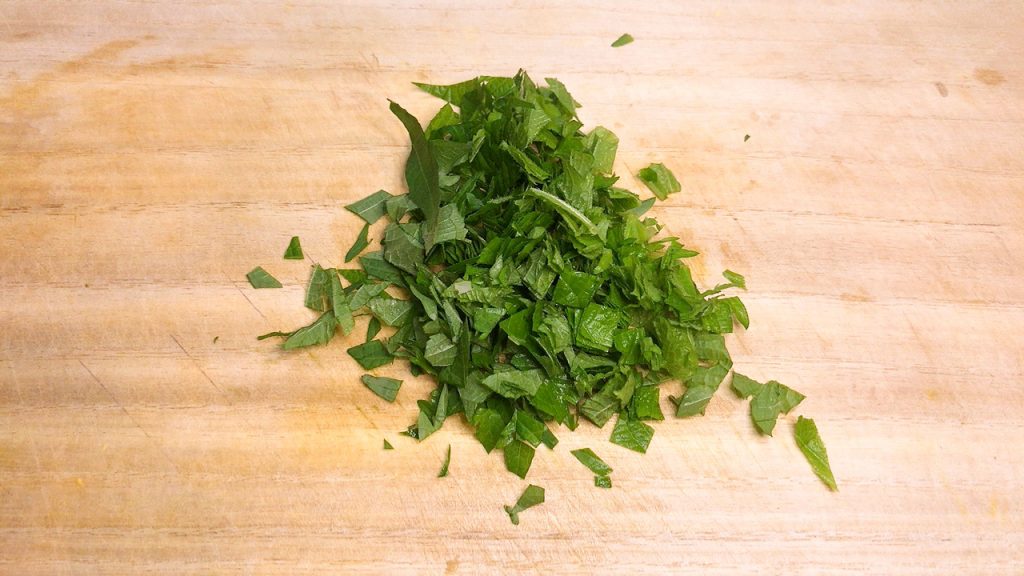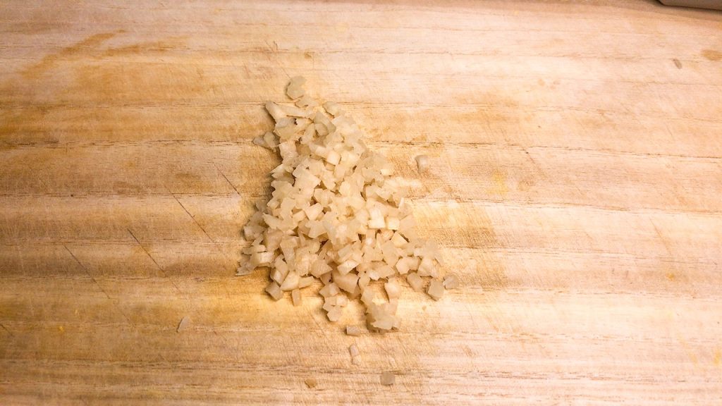 千切りにすると糸状になって口の中に残りやすいので、粗みじん切りにしているそうです。