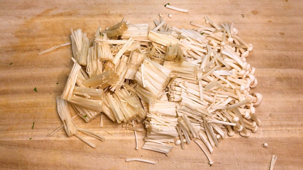 えのきは石突を切り落として3㎝長さに切ってほぐす。