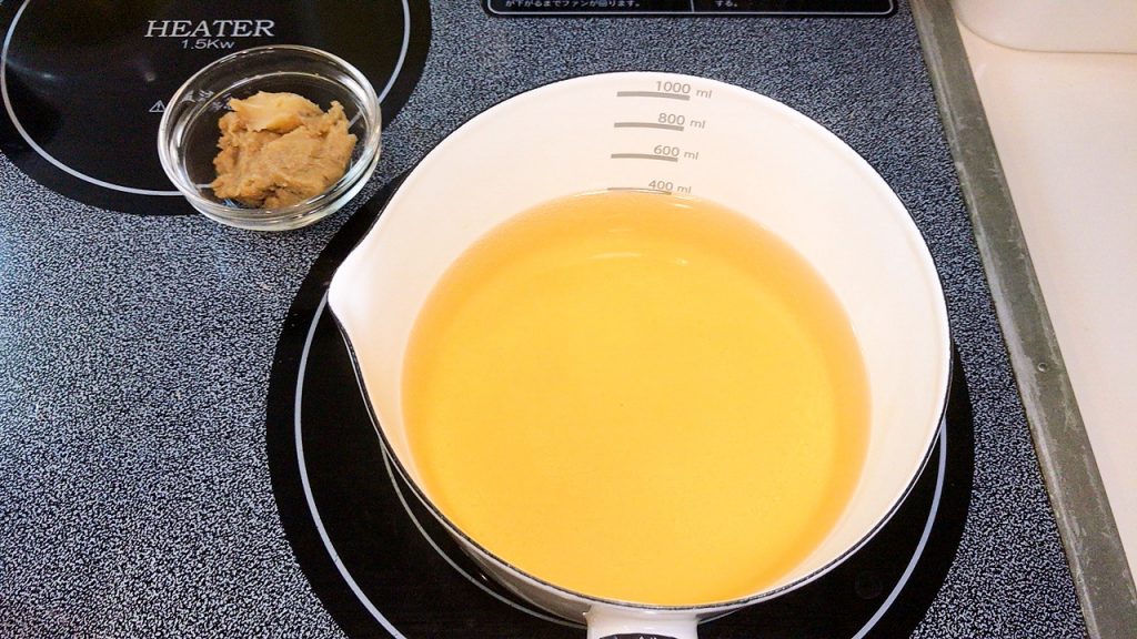 鍋にかつお出汁を入れて火にかけ、沸いてきたらみそを溶きます。