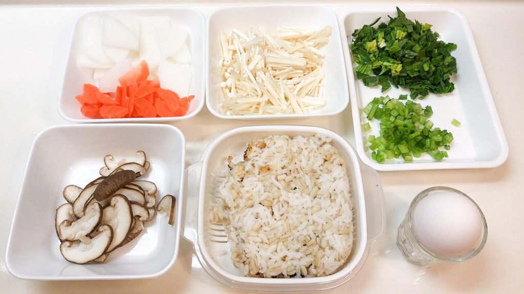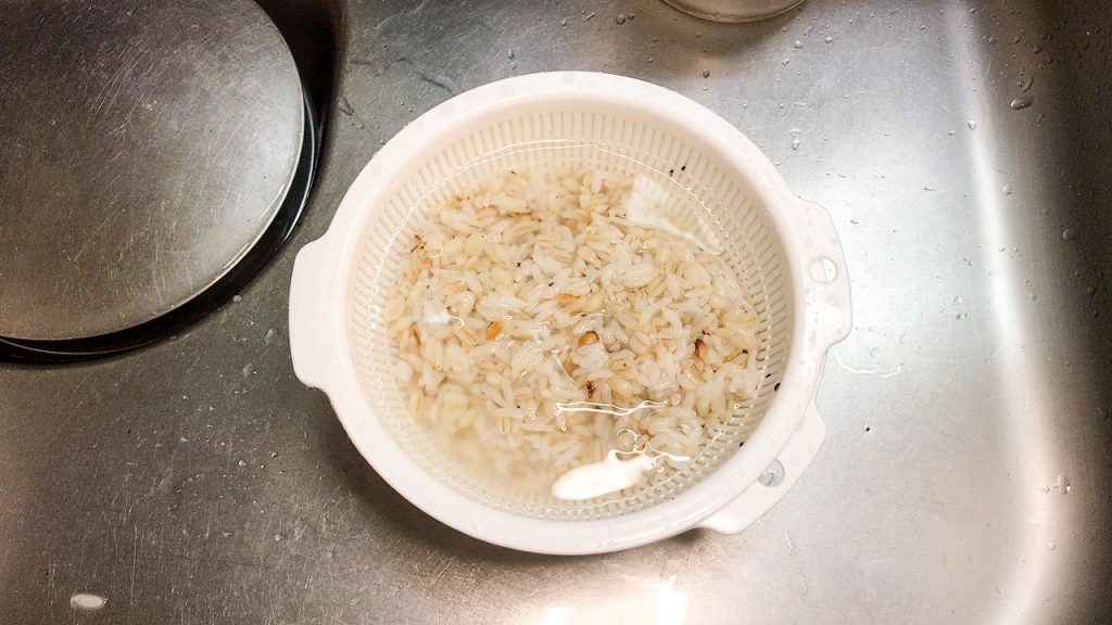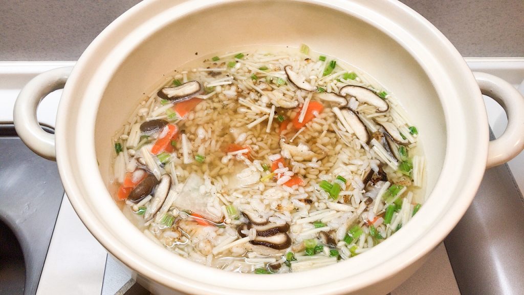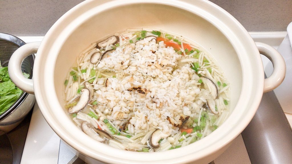 ご飯をざるで軽く洗うことでぬめりがなくなり、味が染みやすくなりサラサラとした雑炊ができます。