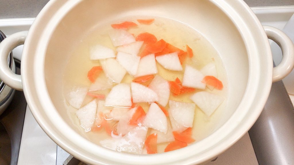 根菜は他の野菜やきのこ に比べて火が入るのに時間がかかるので、出汁が冷たい状態から入れます。