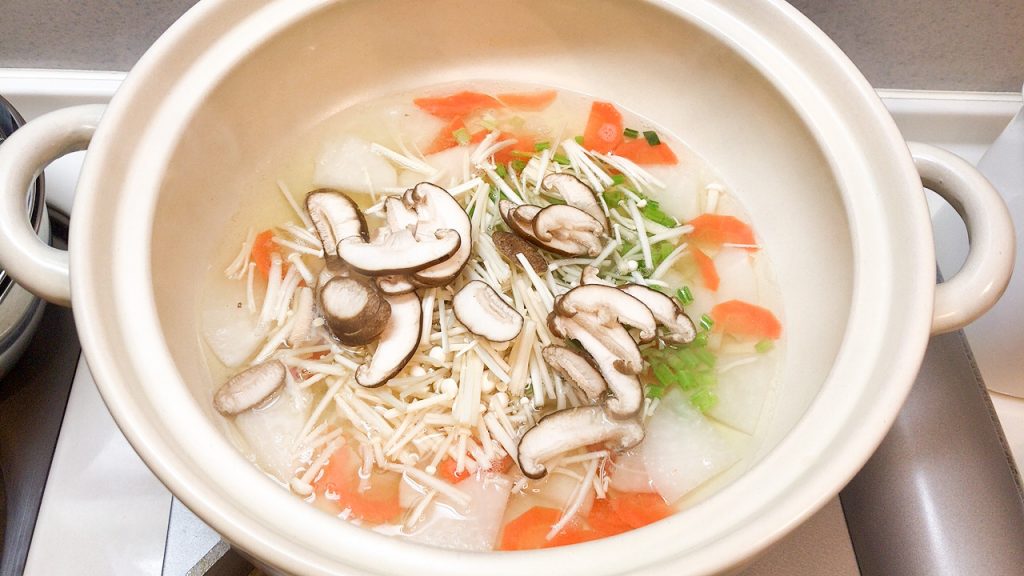大根とにんじんは半月切りかいちょう切り、椎茸は薄切り、えのきは3cm幅に切り、カニカマはほぐしておきました。