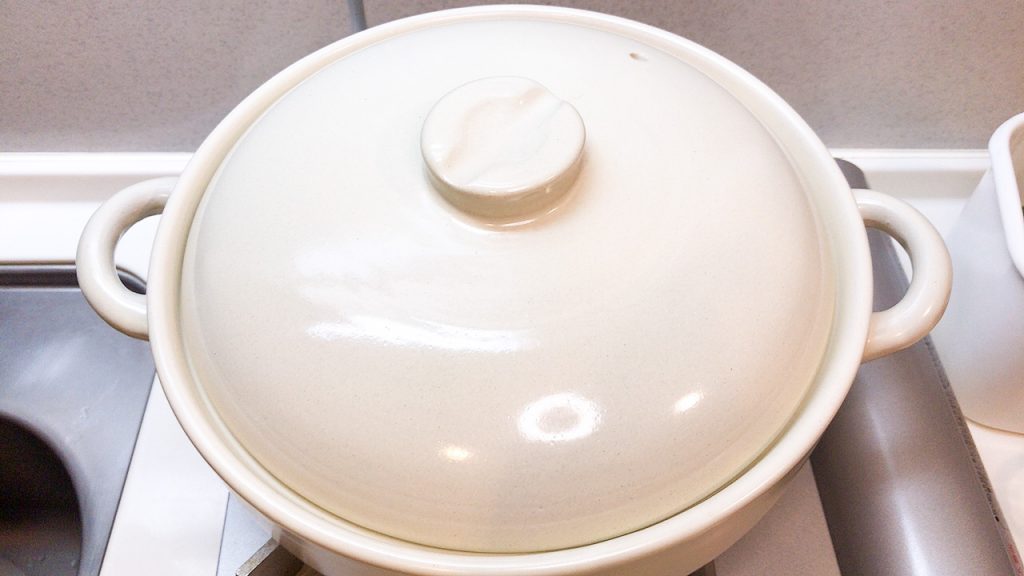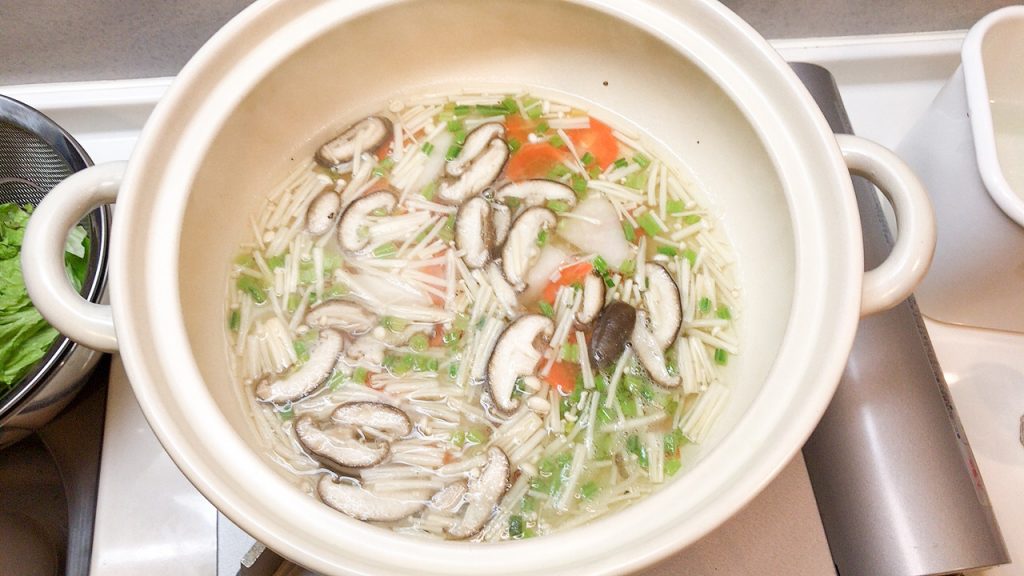 鍋が煮立ってきたら、ほうれん草の葉以外の具材を入れます。