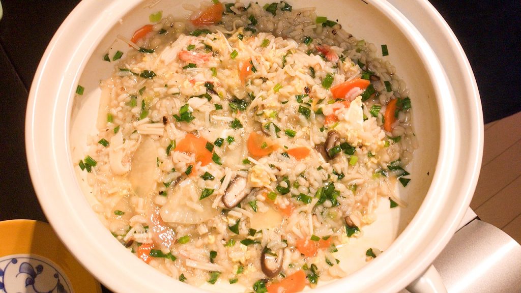 先日かにの出汁を取ったのですが、そのときの出汁でかに雑炊を作ってみました。