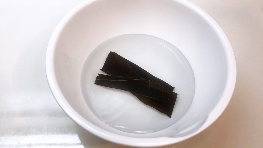 ボウルなどに昆布、水2と1/2カップを入れて15分以上おき、昆布を戻しておきます。