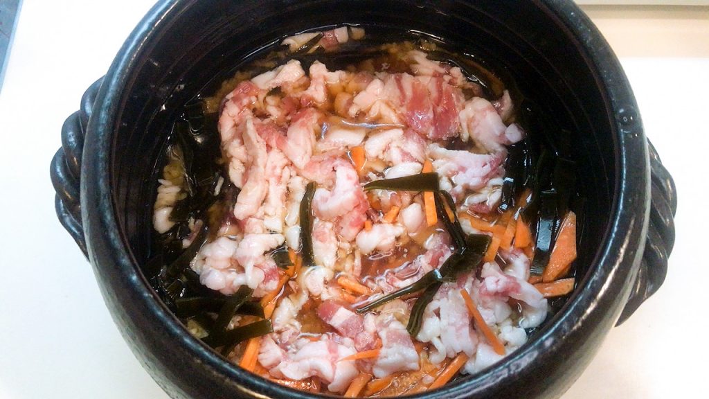 昆布、豚肉、にんじんをのせ、上の方だけ混ぜて炊きます。