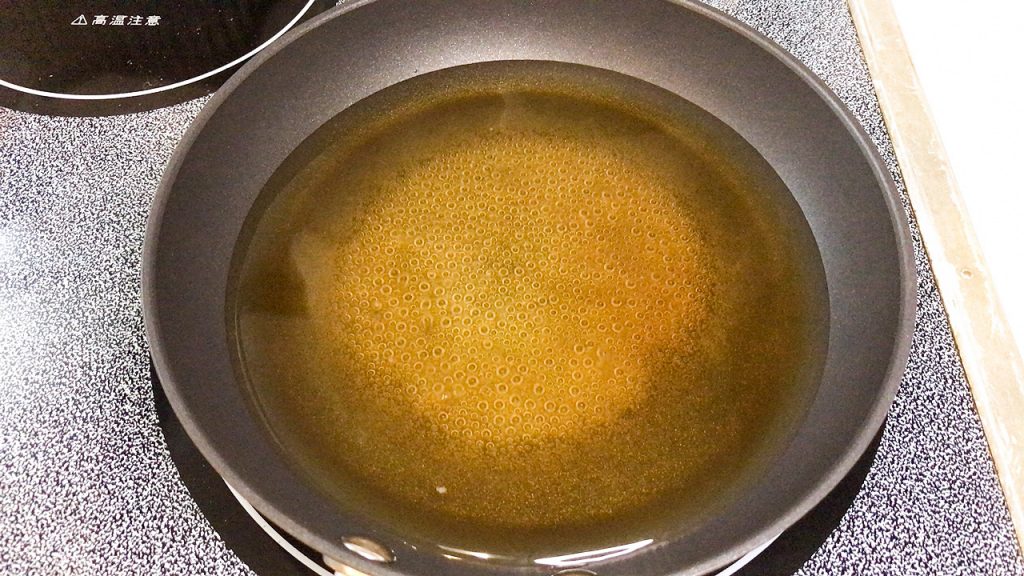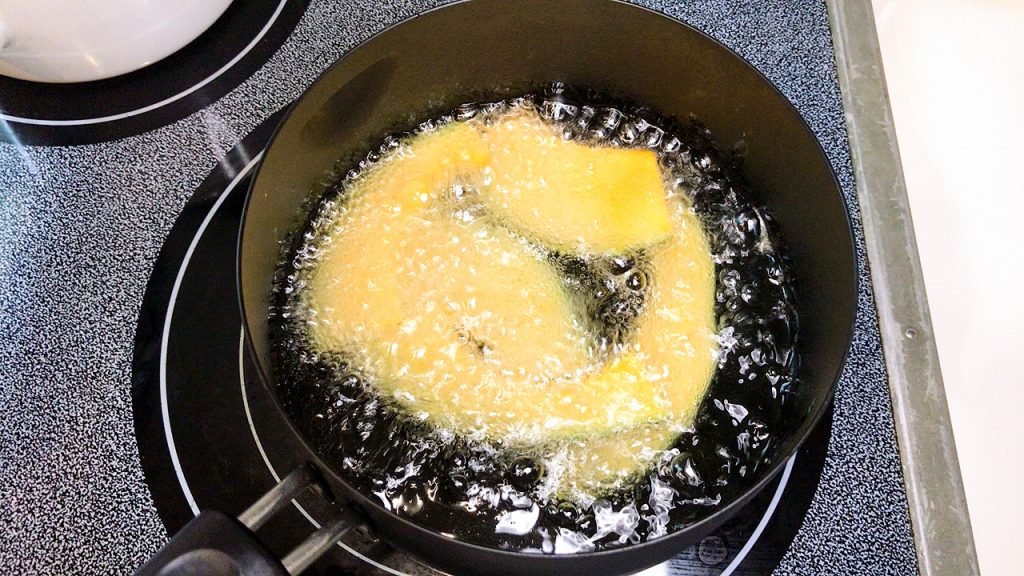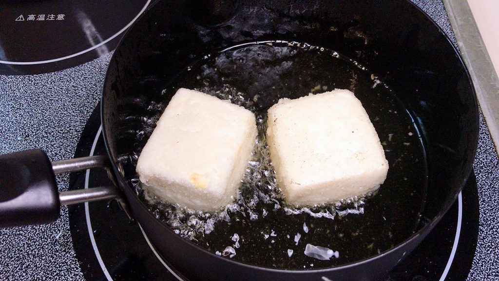油は少なめなので豆腐が油全体に浸かっていませんが、面を変えて揚げます。