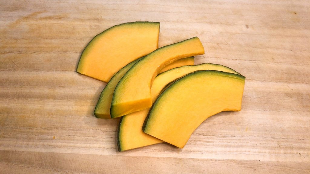 かぼちゃは1cm幅に切ります。かぼちゃを切るときはてこの原理でおさえて切っていくと良いです。