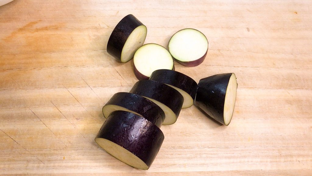なすは輪切りにして、水にさらします。