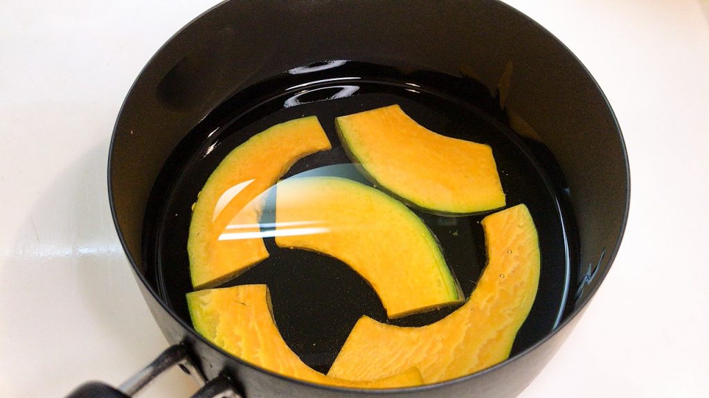かぼちゃを鍋に入れて、かぶるくらいのサラダ油を入れて火にかけ弱火で揚げます。