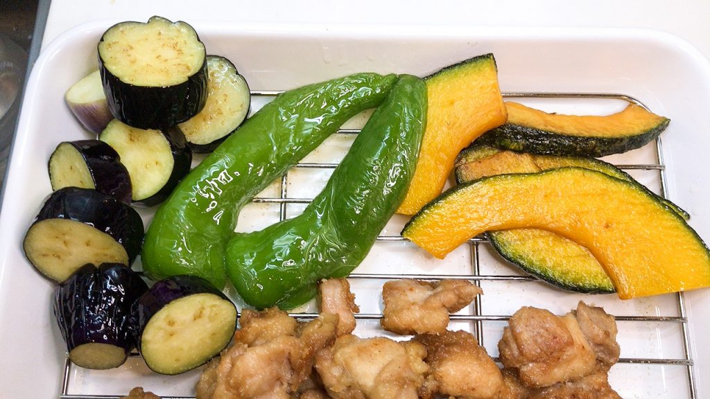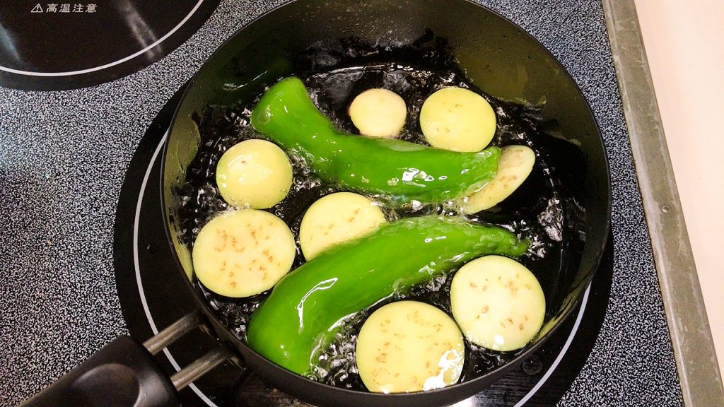 なすは水分をよく拭き取って素揚げします。