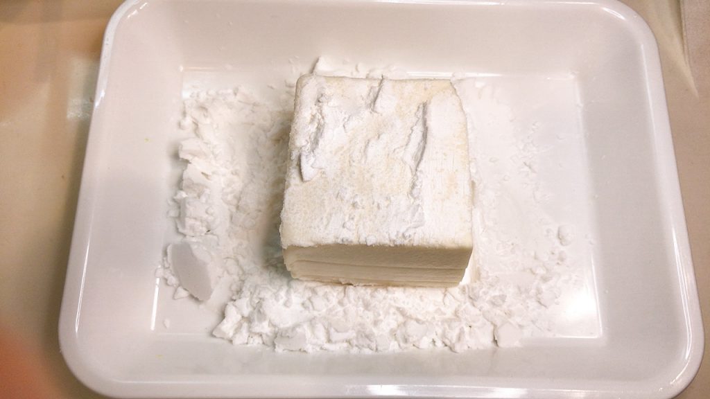 豆腐は食べやすい大きさに切って、表面に薄く片栗粉をまぶして揚げます。