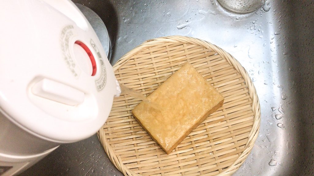 厚揚げはザルに並べ、熱湯をまわしかけて油抜きをします。