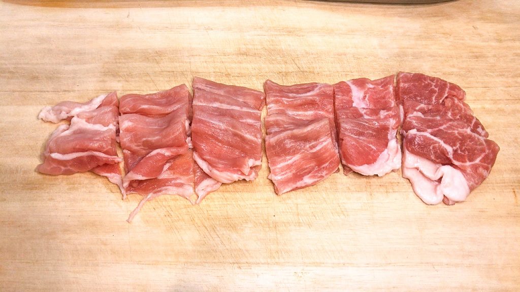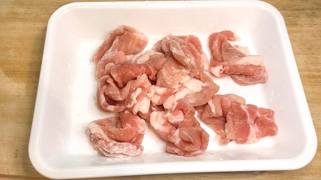 豚肉は大きければ一口大に切り、片栗粉をまぶします。
