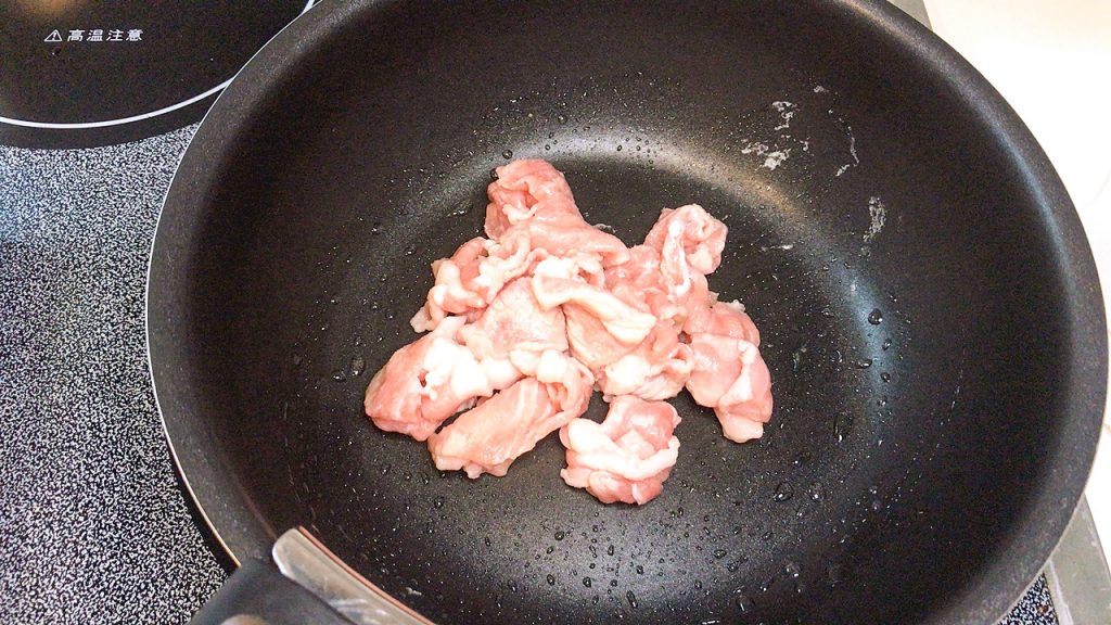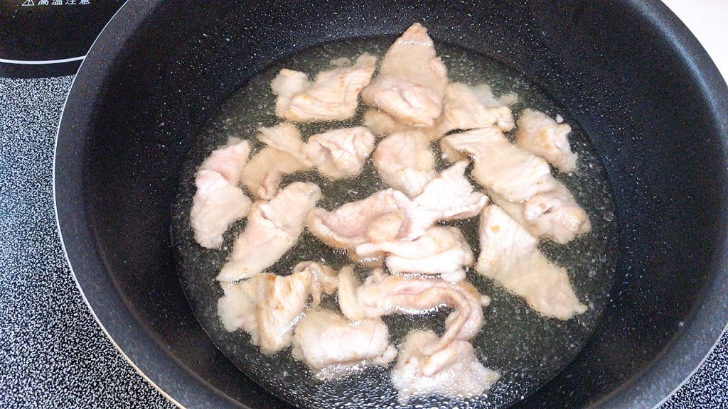 鍋かフライパンに油大さじ1を熱して豚肉を炒めます。