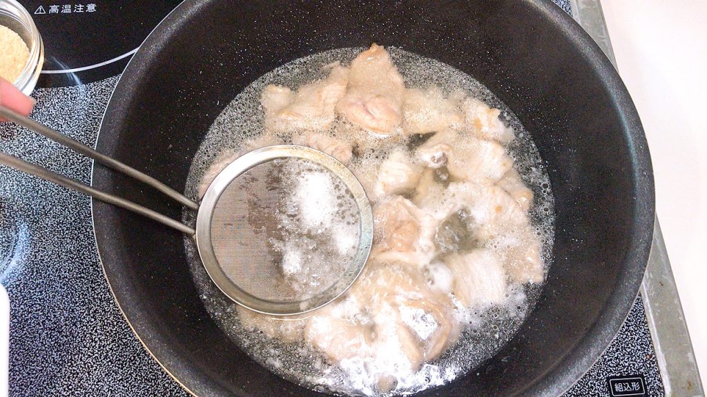 肉の色が変わったら出汁を加え、煮立ったらアクを除きます。
