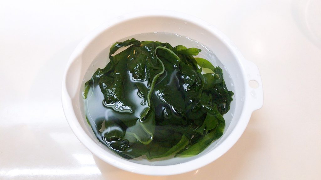 わかめは洗って塩を落とし、たっぷりの水に5分つけてもどします。