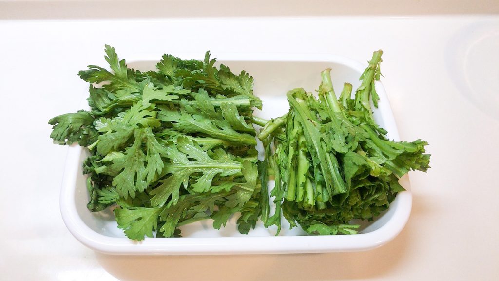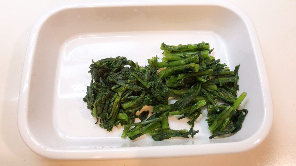 私の場合は、先に春菊の茎の部分を入れて30秒茹でて、葉の部分も加えてさらに30秒茹でました。