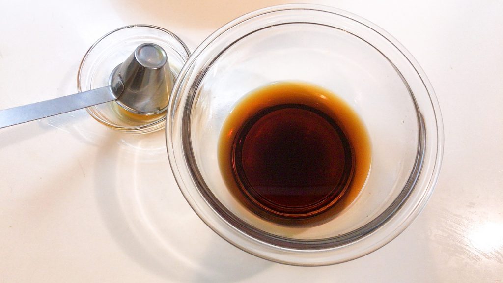 ボウルに出汁と醤油を混ぜて出汁醤油を作ります。