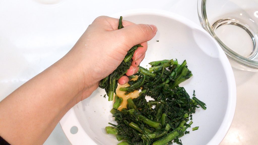 春菊を絞りすぎてしまうと繊維が残ってしまって筋っぽいおひたしになってしまうので気をつけてください。