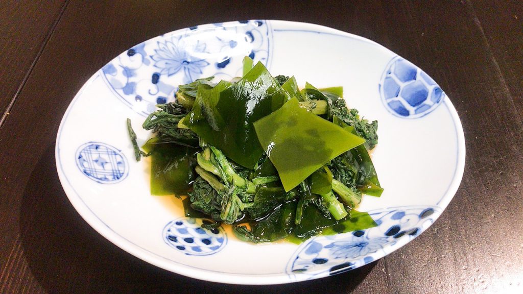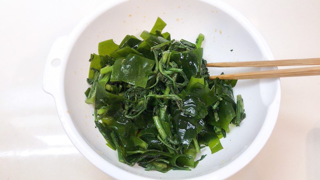 春菊に残りの出汁醤油、わかめを加えてよく混ぜあわせて完成です。